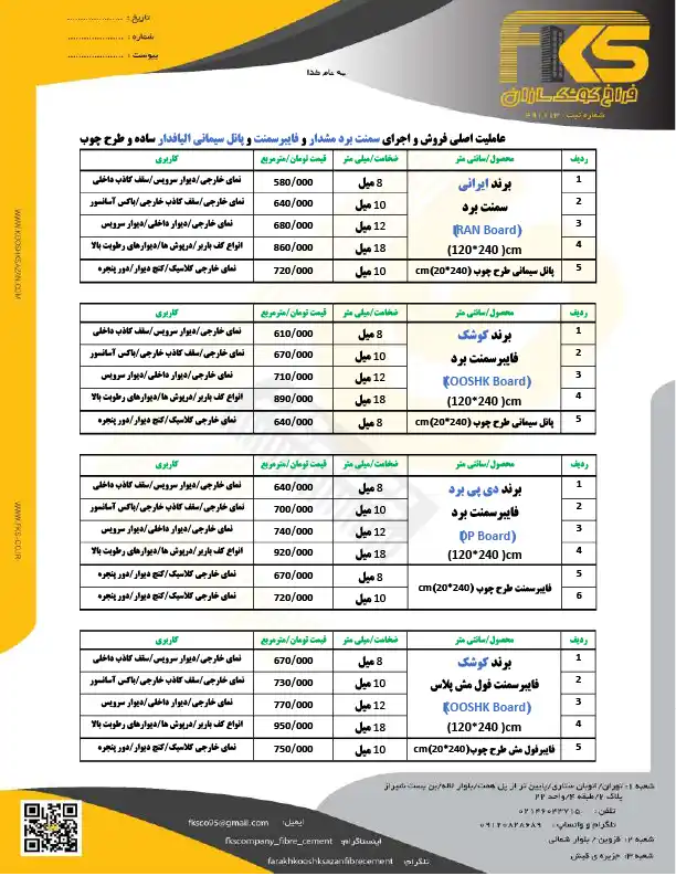لیست قیمت فایبر سمنت برد در شرکت فراخ کوشک سازان شامل موارد زیر است :